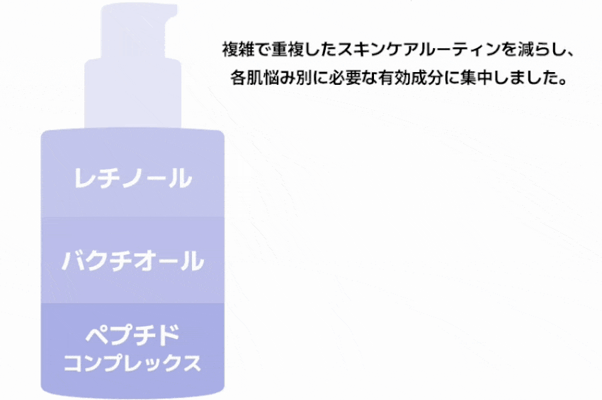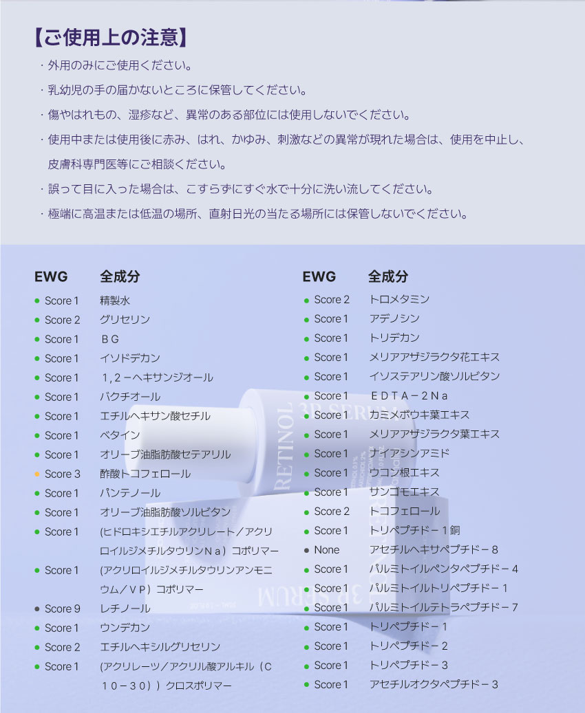 | 全成分表示 | 精製水、グリセリン、BG、イソドデカン、1,2-ヘキサンジオール、バクチオール、エチルヘキサン酸セチル、ベタイン、オリーブ油脂肪酸セテアリル、酢酸トコフェロール、パンテノール、オリーブ油脂肪酸ソルビタン、(ヒドロキシエチルアクリレート/アクリロイルジメチルタウリンNa)コポリマー、(アクリロイルジメチルタウリンアンモニウム/VP)コポリマー、レチノール、ウンデカン、エチルヘキシルグリセリン、(アクリレーツ/アクリル酸アルキル(C10-30))クロスポリマー、トロメタミン、アデノシン、トリデカン、メリアアザジラクタ花エキス、イソステアリン酸ソルビタン、EDTA-2Na、カミメボウキ葉エキス、メリアアザジラクタ葉エキス、ナイアシンアミド、ウコン根エキス、サンゴモエキス、トコフェロール、トリペプチド-1銅、アセチルヘキサペプチド-8、パルミトイルペンタペプチド-4、パルミトイルトリペプチド-1、パルミトイルテトラペプチド-7、トリペプチド-1、トリペプチド-2、トリペプチド-3、アセチルオクタペプチド-3 |